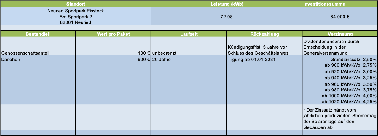 Unsere Mitglieder haben die Möglichkeit, sich an der Finanzierung der PV-Anlage am Standort Am Sportpark 2, 82061 Neuried zu beteiligen.